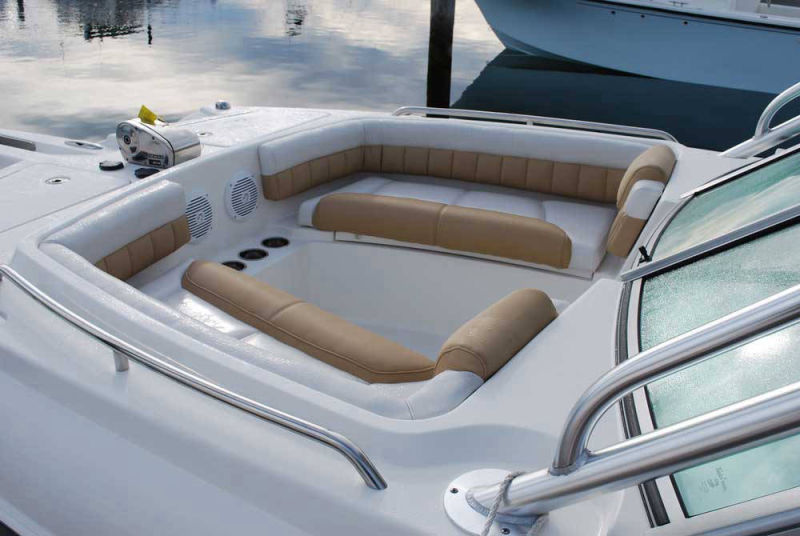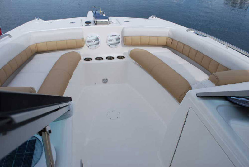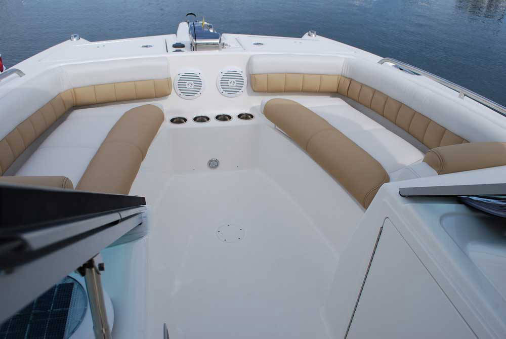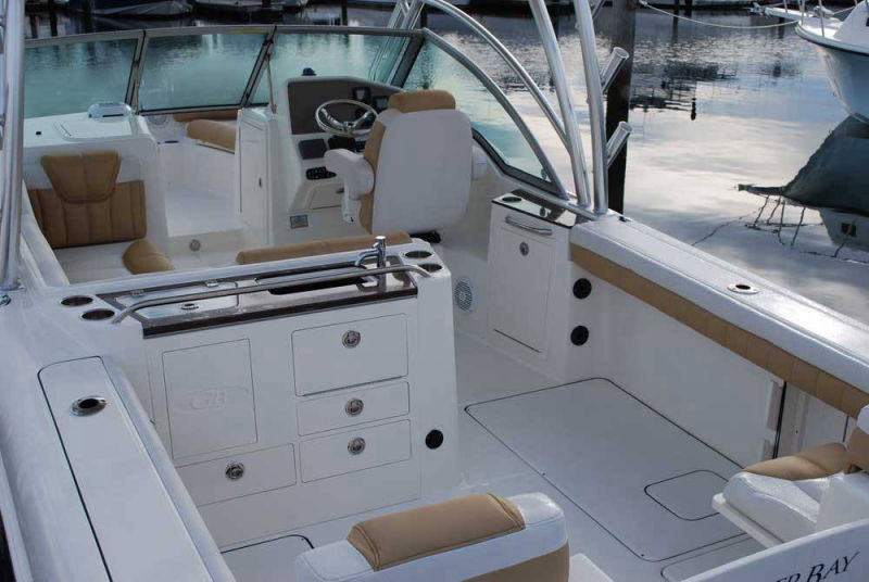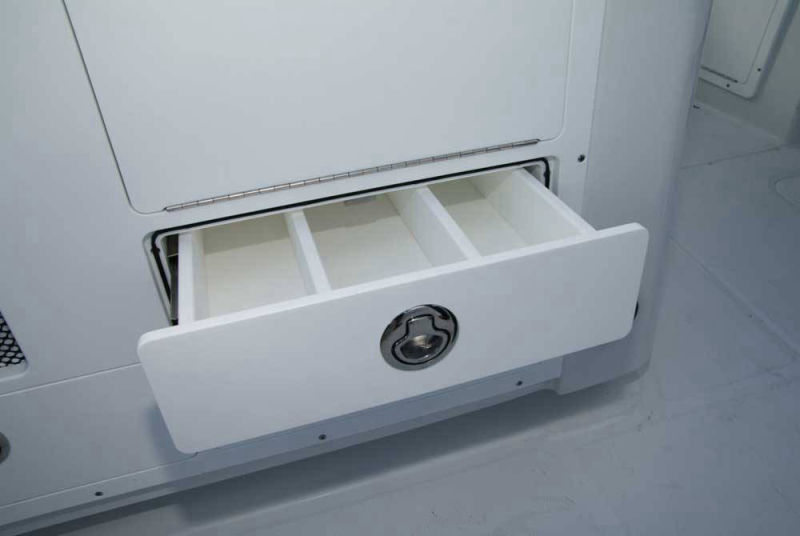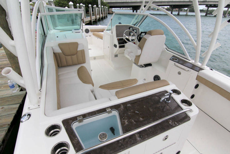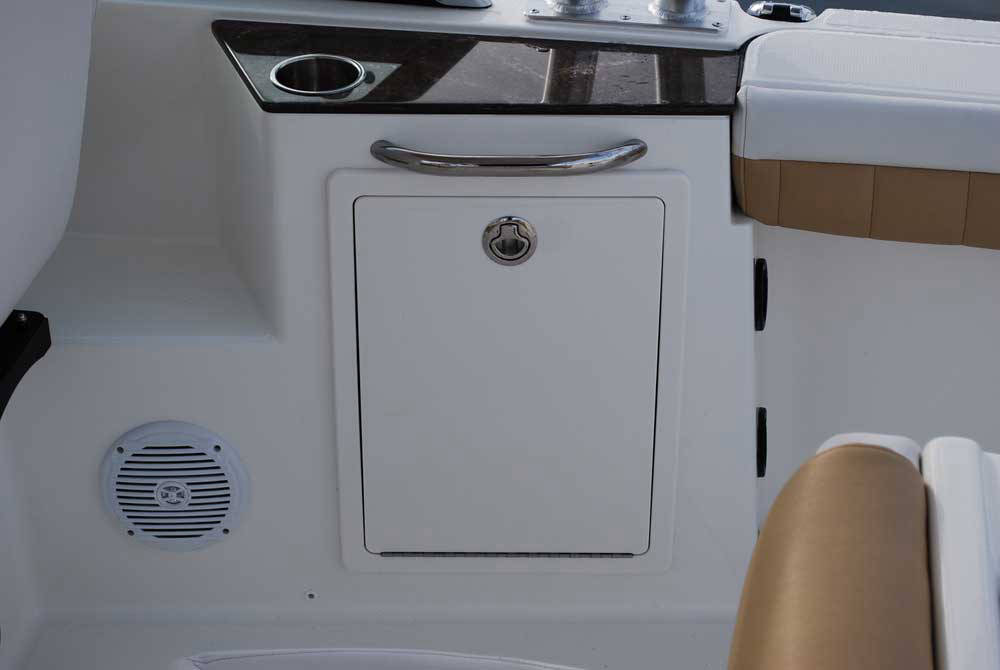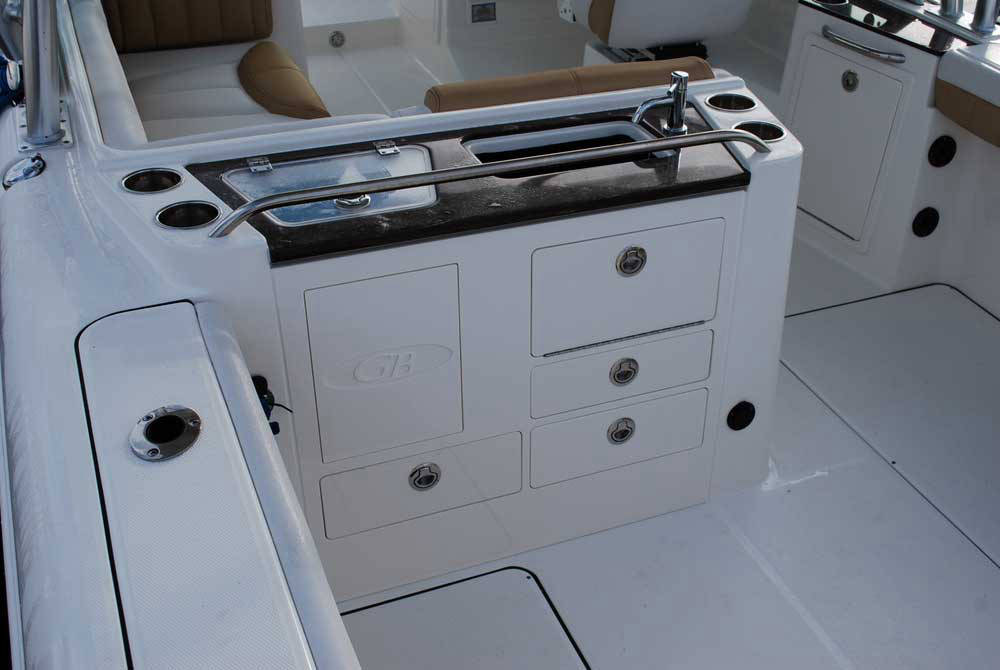 • Fiberglass entertainment center/wet bar with 20-gallon overboard draining livewell, sink with fresh-water faucet, Corian counter top, 4 stainless steel cup holders, and 4 dry storage drawers