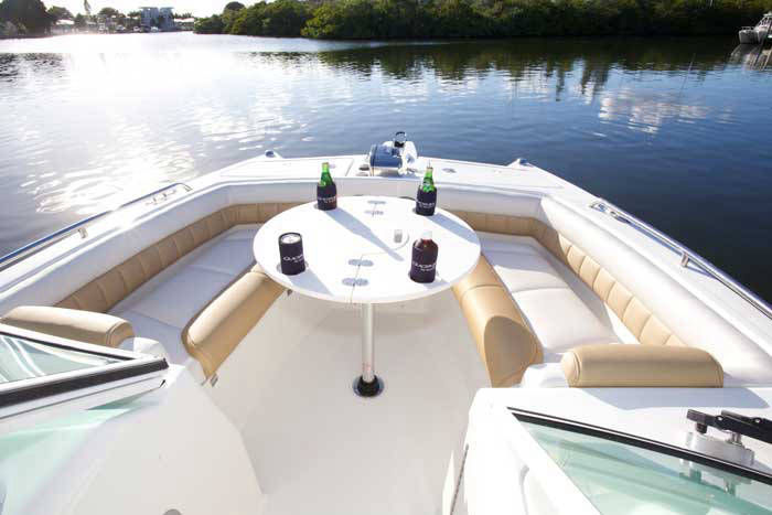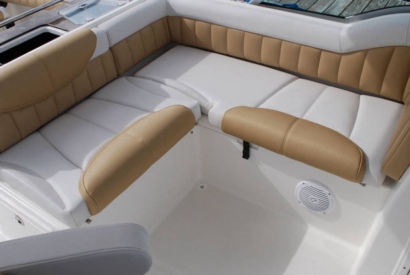 • Insulated, lockable 150 quart L-lounge storage cooler with overboard drains