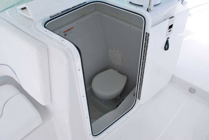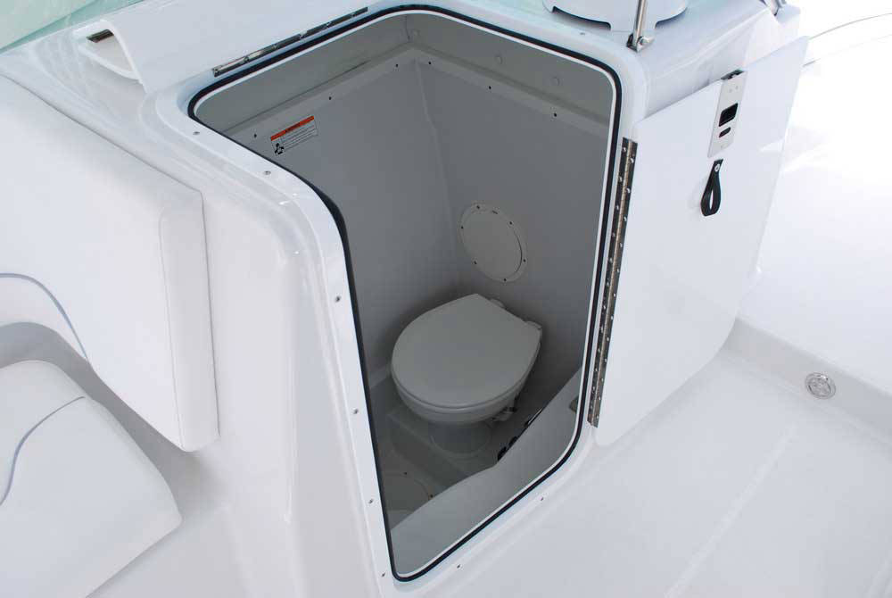 • Oversized walk-in changing area with large entry door, LED light, and solar ventilation portlight