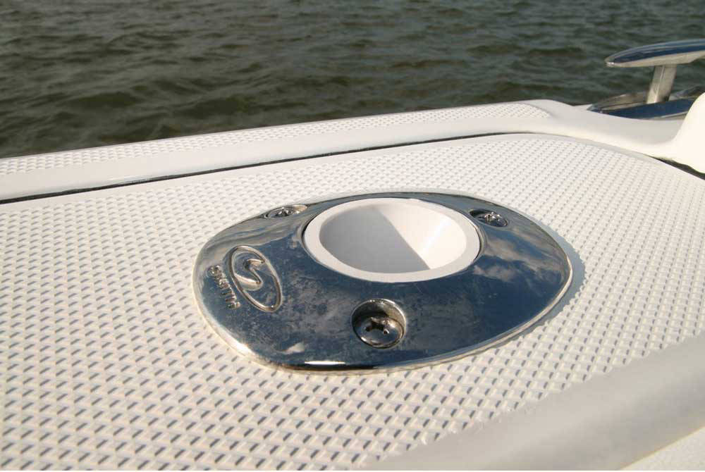 • Port and starboard deck caps with rod and gaff storage for 4 rods