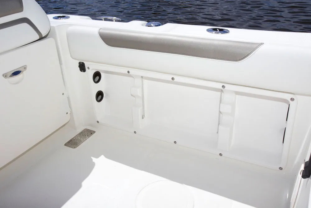 • Starboard seatbox houses 30-gallon insulated livewell with a 1100-gph magnetic drive pump and overboard drain
