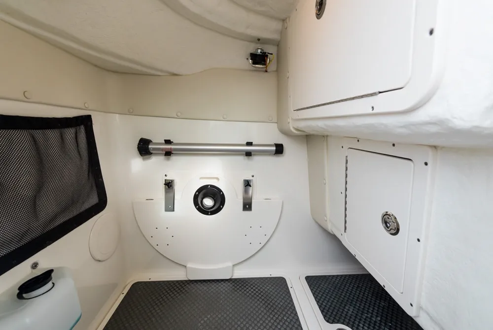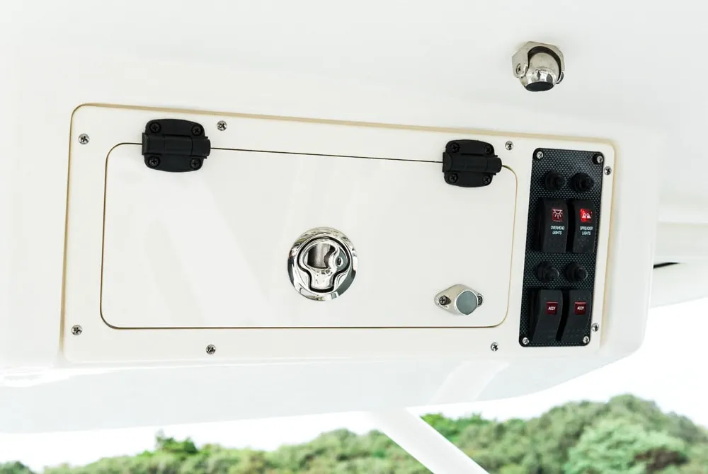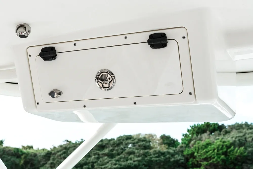 • Starboard console storage area with removable floor lids for access to 3 batteries and waste tank. Area also provides access to electronics and storage for the optional bow table.