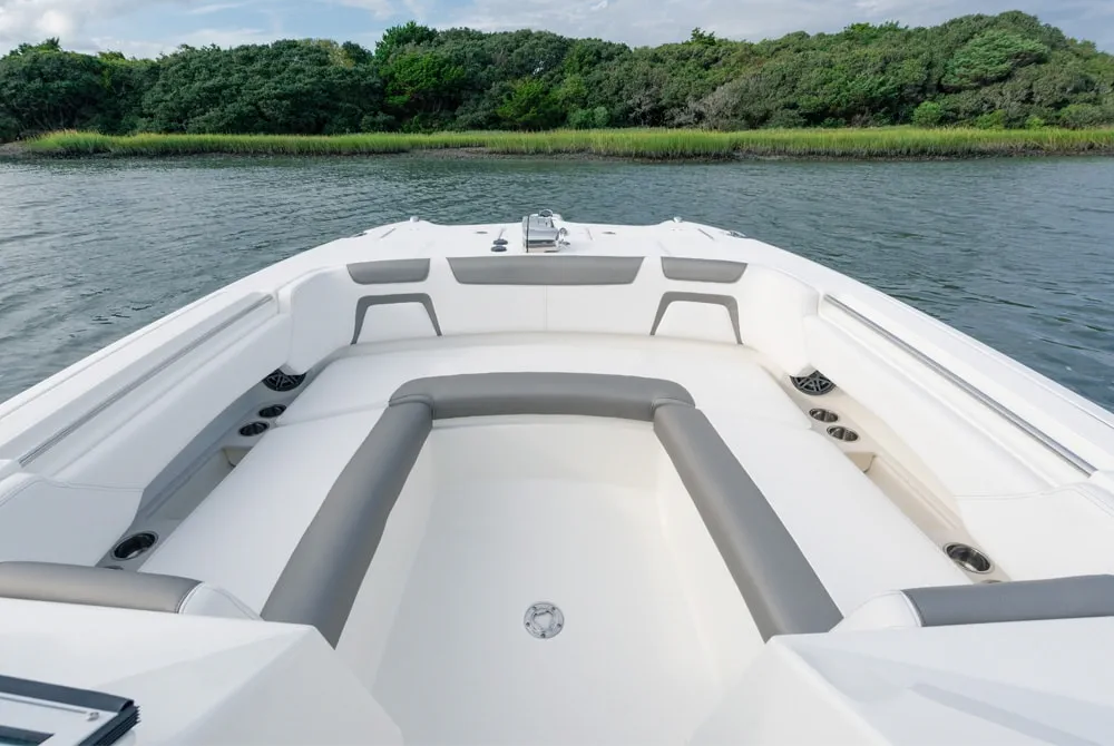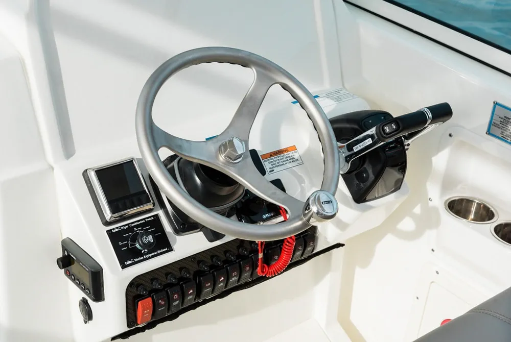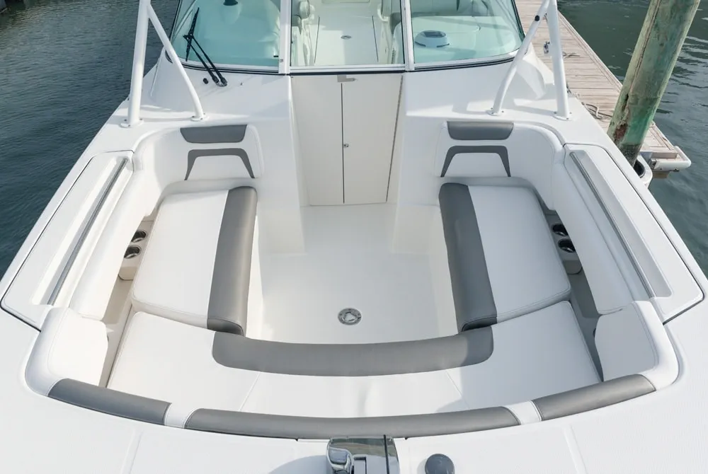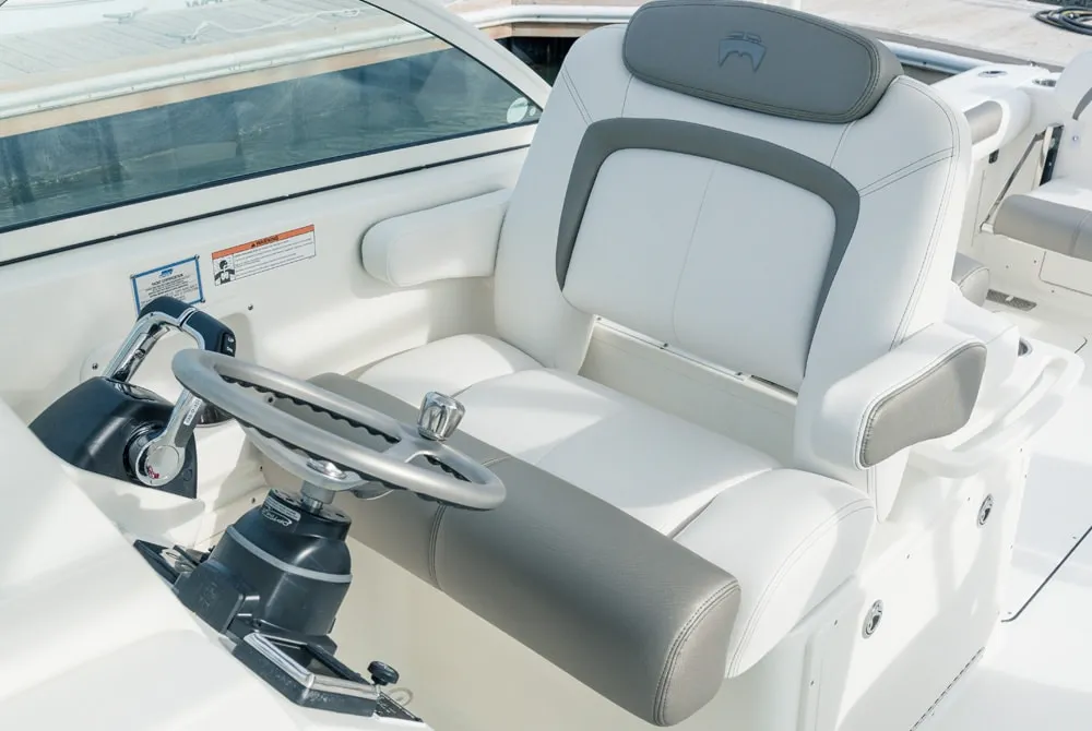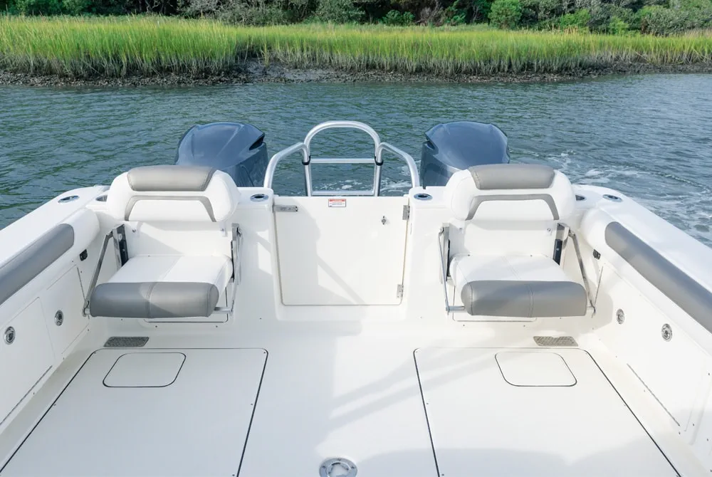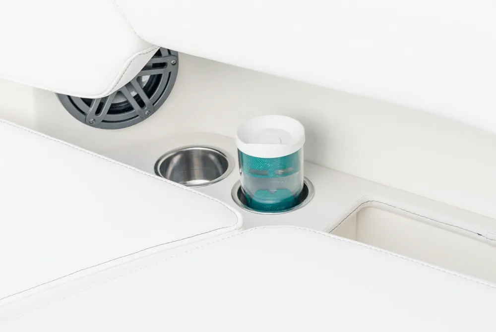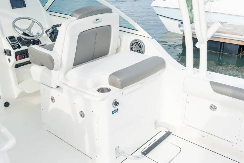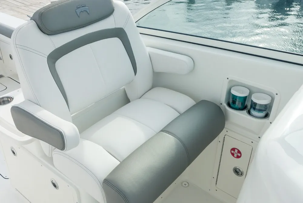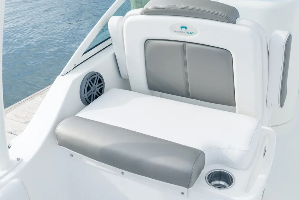 • Helm and passenger dual custom seats with nearby recessed stainless steel cup holders. Helm seat has flip-up bolster.