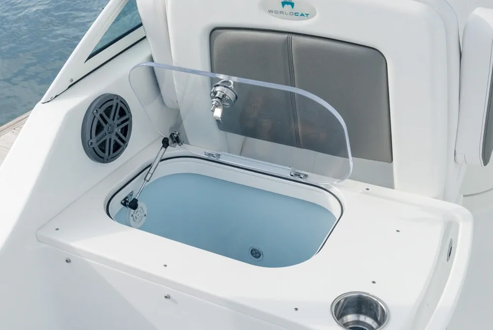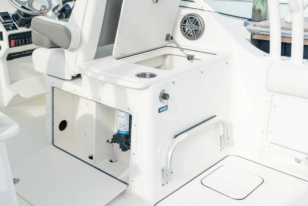 • Port seatbox houses 30-gallon insulated livewell with 1100-gph magnetic drive pump, overboard drain, and a clear lid