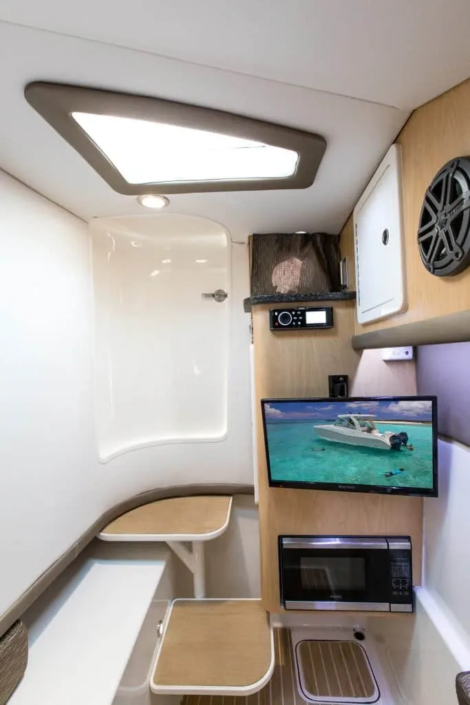 The 325DC is designed to pamper you and your guests. From the plush bow seating to the expansive cockpit and comfortable helm station, every detail has been meticulously crafted to create a luxurious experience. The enclosed head compartment with a shower and the available full galley provide all the comforts of home for extended trips and overnight stays.