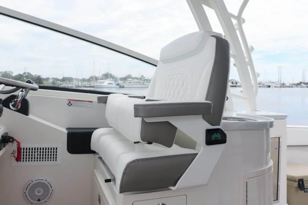 • Adjustable helm bench seat with inboard, pull-up armrest and single bolster system