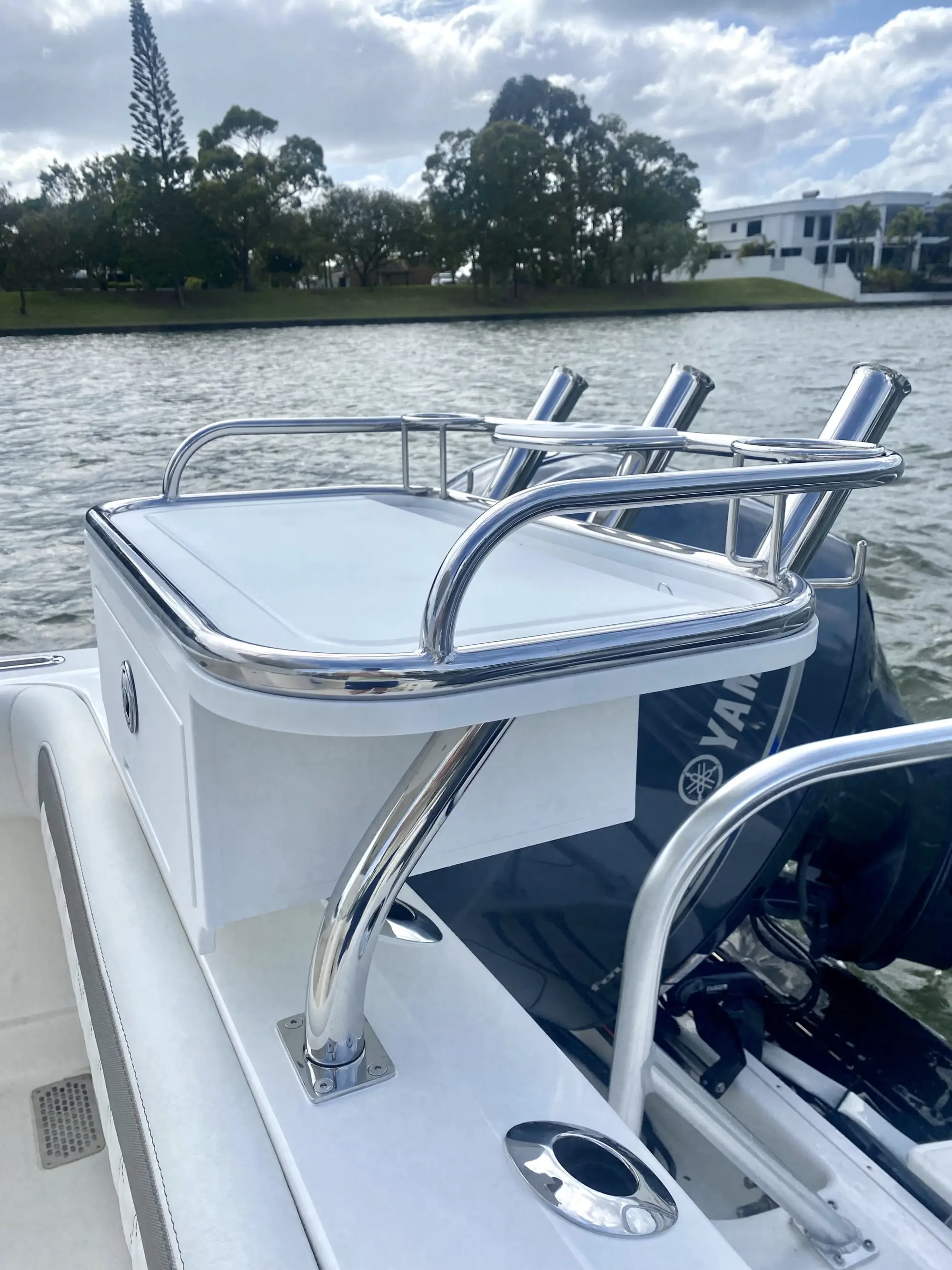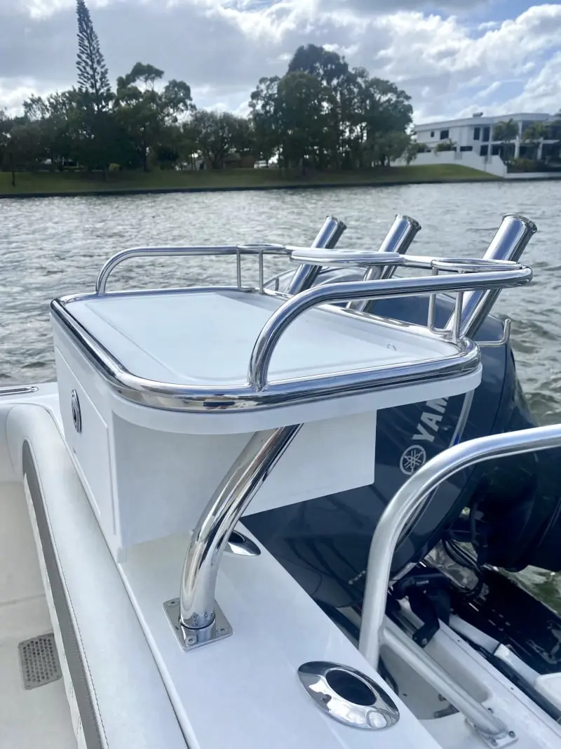 - Bait station with lockable tackle drawer, SS gaff with wall mounting bracket, and extra cup/bait holders on gunnels