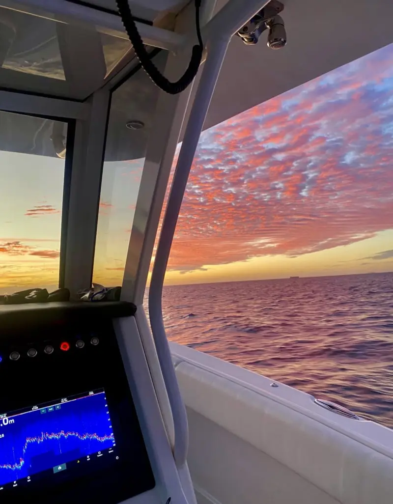 • Glass dash console with standard Garmin GPSMAP® 7612xsv 12-inch multi-touch widescreen display with Airmar® B117 depth/temp thru-hull transducer