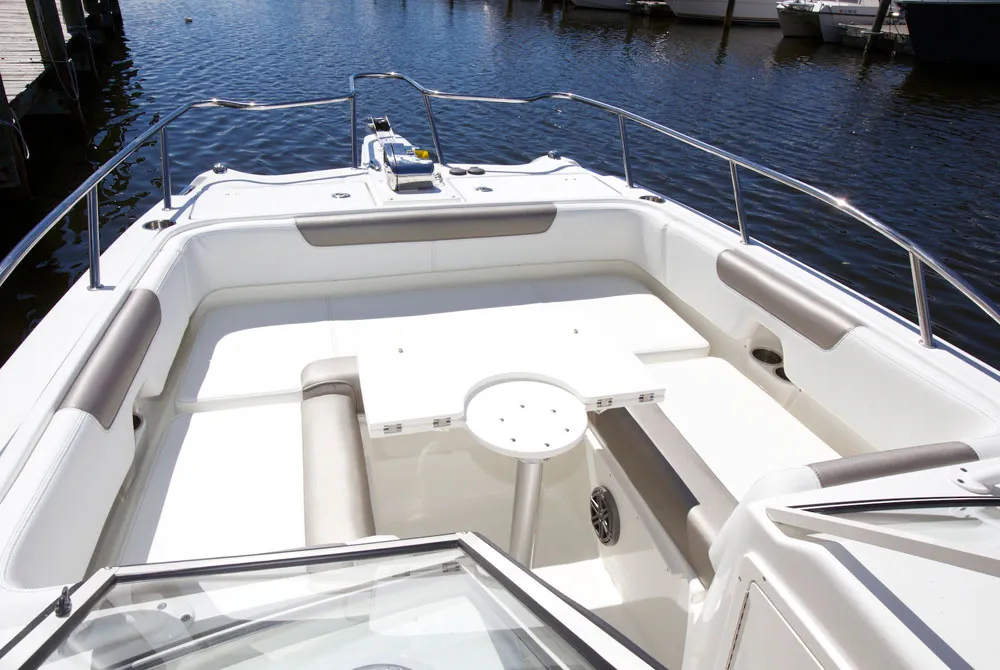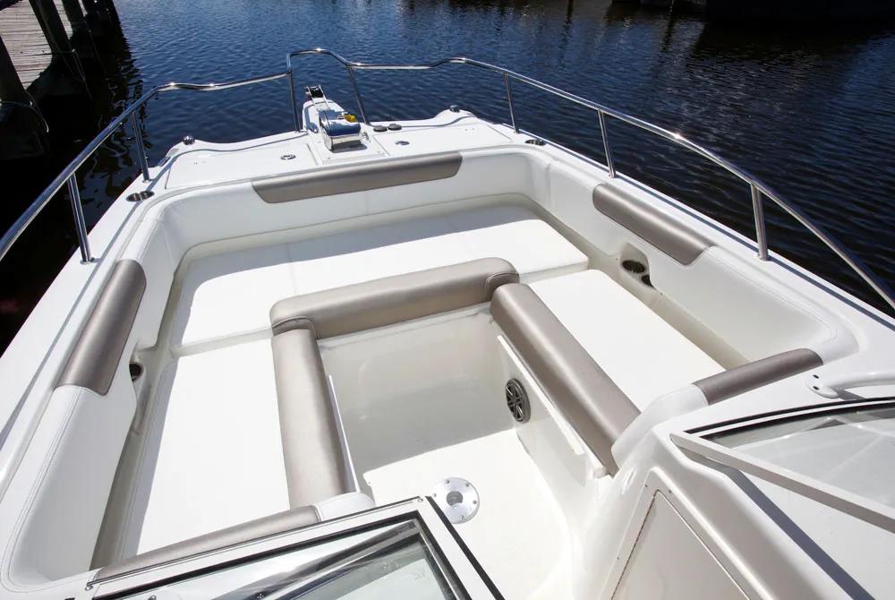 • Forward sun lounge featuring port and starboard cushioned seats for 6 adults with wraparound coaming pad seat backs