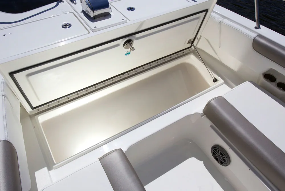 • Large lockable dry storage compartment in front of helm console