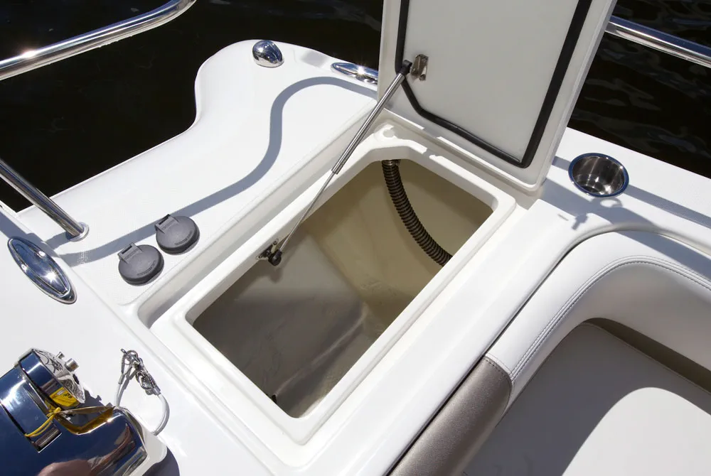 • Starboard seatbox houses 30-gallon insulated livewell with a 1100-gph magnetic drive pump and overboard drain