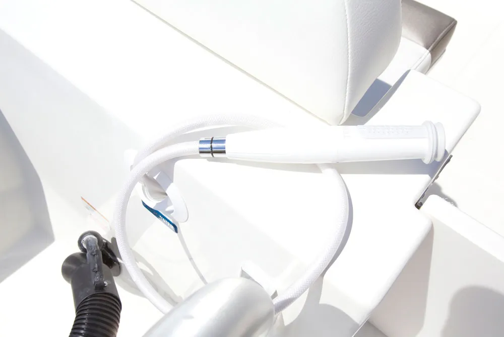 • Enclosed lockable changing area and a freshwater electric pump-out head, 10-gallon holding tank and overboard discharge (portside console)