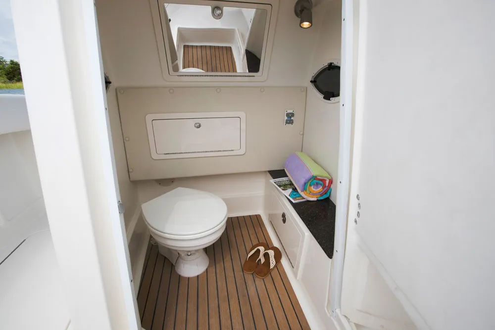 • Fiberglass lined head compartment with fresh water head system, 9-gallon holding tank, and overboard discharge