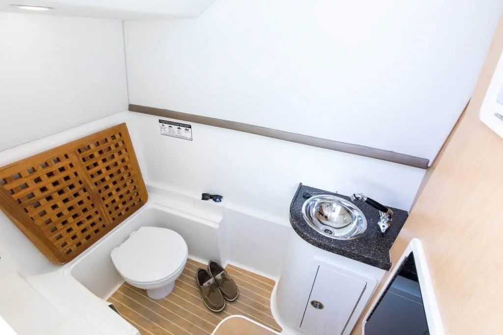 • Marine head with 15-gallon holding tank with overboard discharge, teak grid seat, shower, sump, sink, and Corian counter
