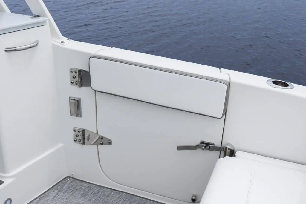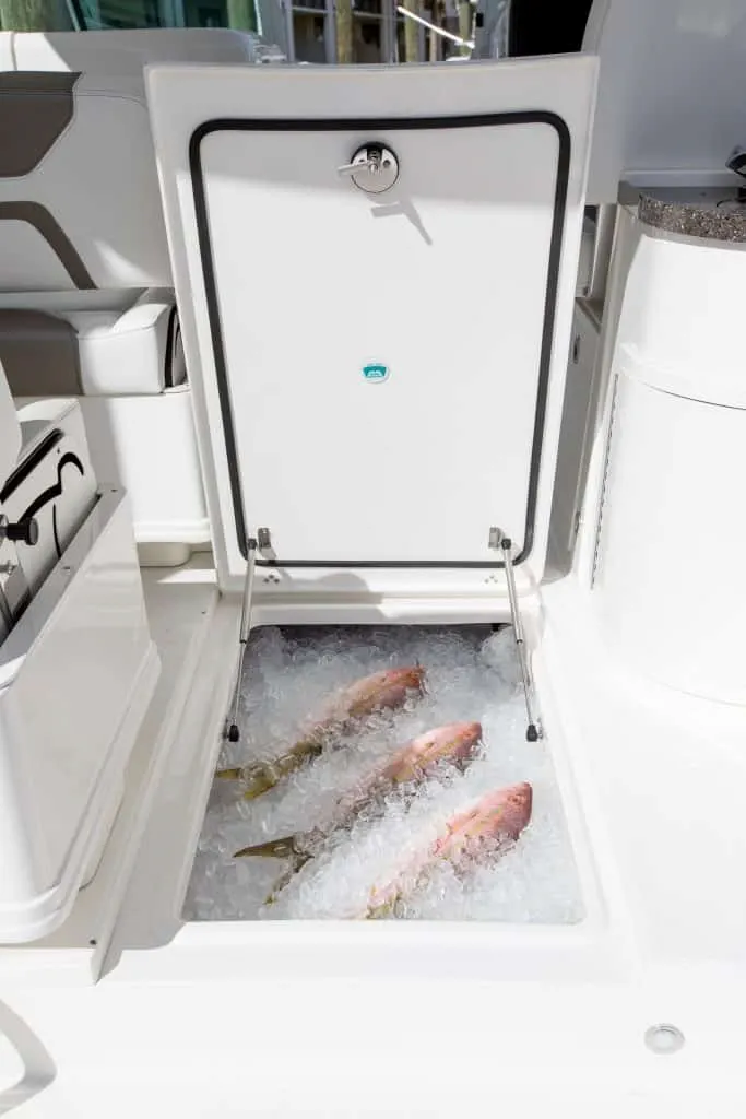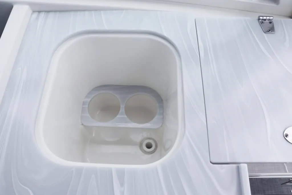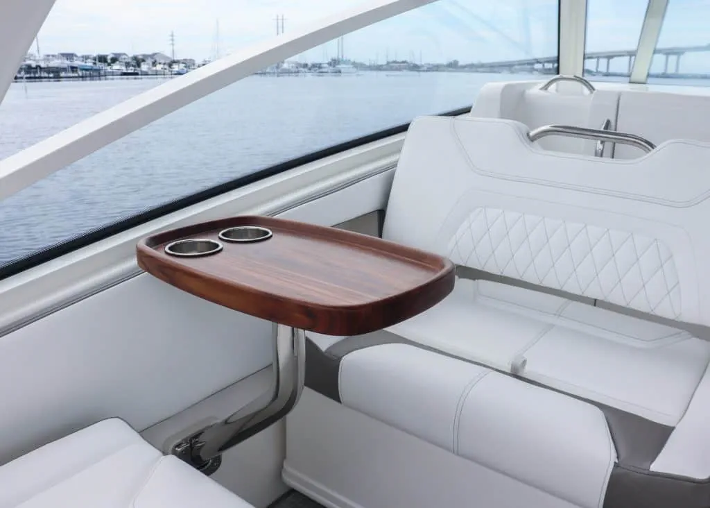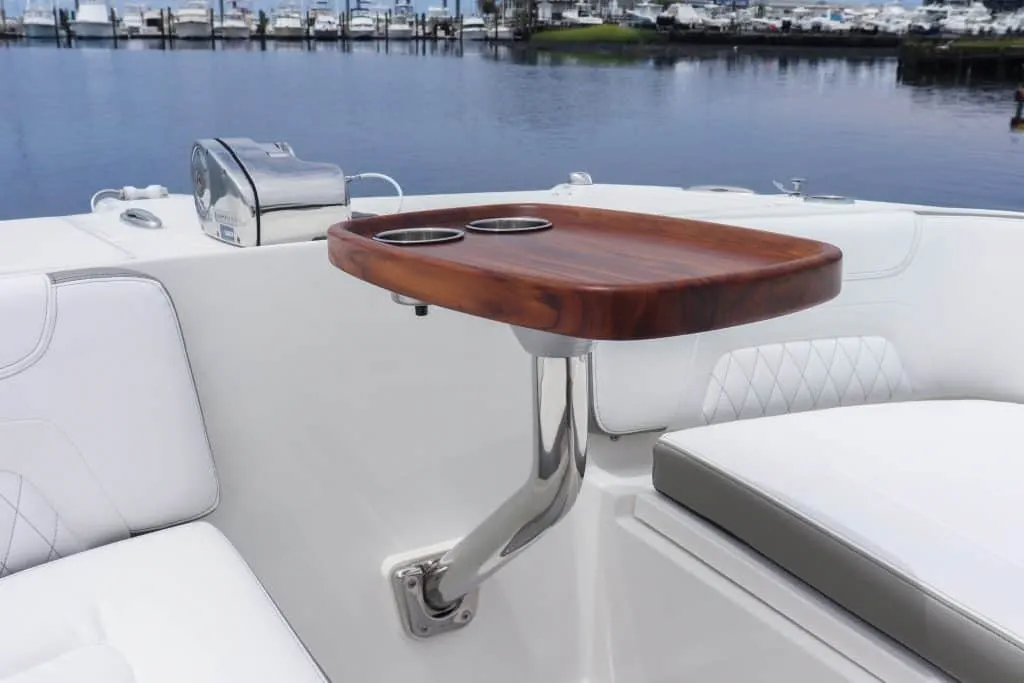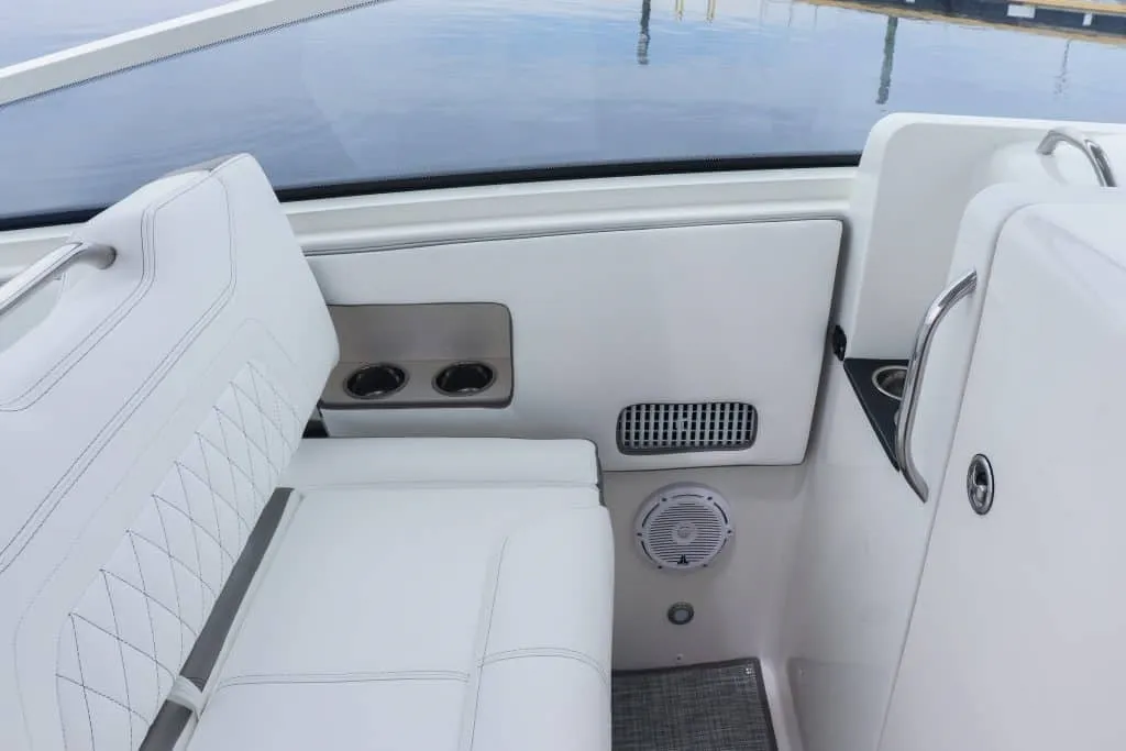• Port and starboard gunwale inserts with 3 cup holders, storage bins, and speakers