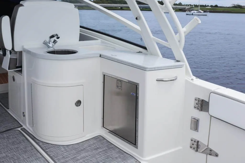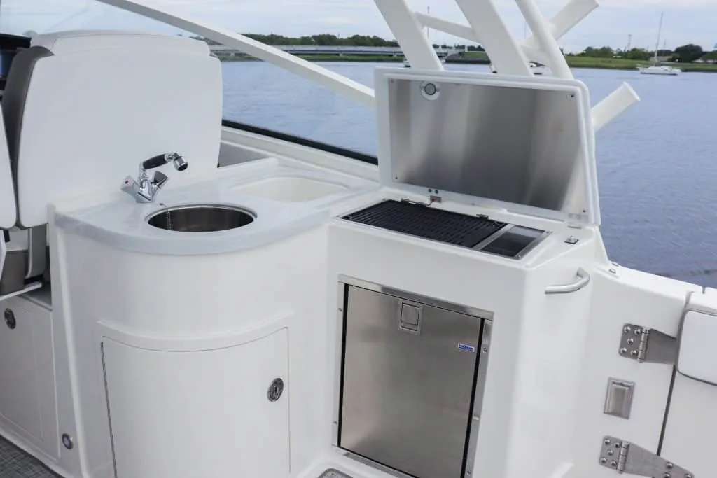 • Starboard side entertainment center with refrigerator, sink, 1300W electric grill with inverter, and utility drawers.