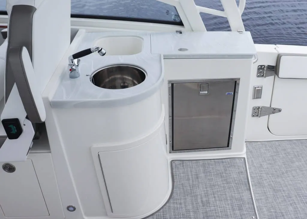 The 325DC is designed to pamper you and your guests. From the plush bow seating to the expansive cockpit and comfortable helm station, every detail has been meticulously crafted to create a luxurious experience. The enclosed head compartment with a shower and the available full galley provide all the comforts of home for extended trips and overnight stays.